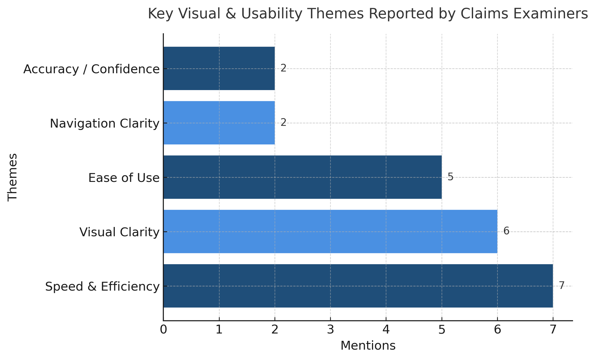 I examined the step-by-step workflows claims examiners followed to complete their work, identifying inefficiencies that directly affected productivity. This surfaced recurring friction points such as inconsistent tab navigation and redundant actions that disrupted focus and quota completion.Thematic Analysis