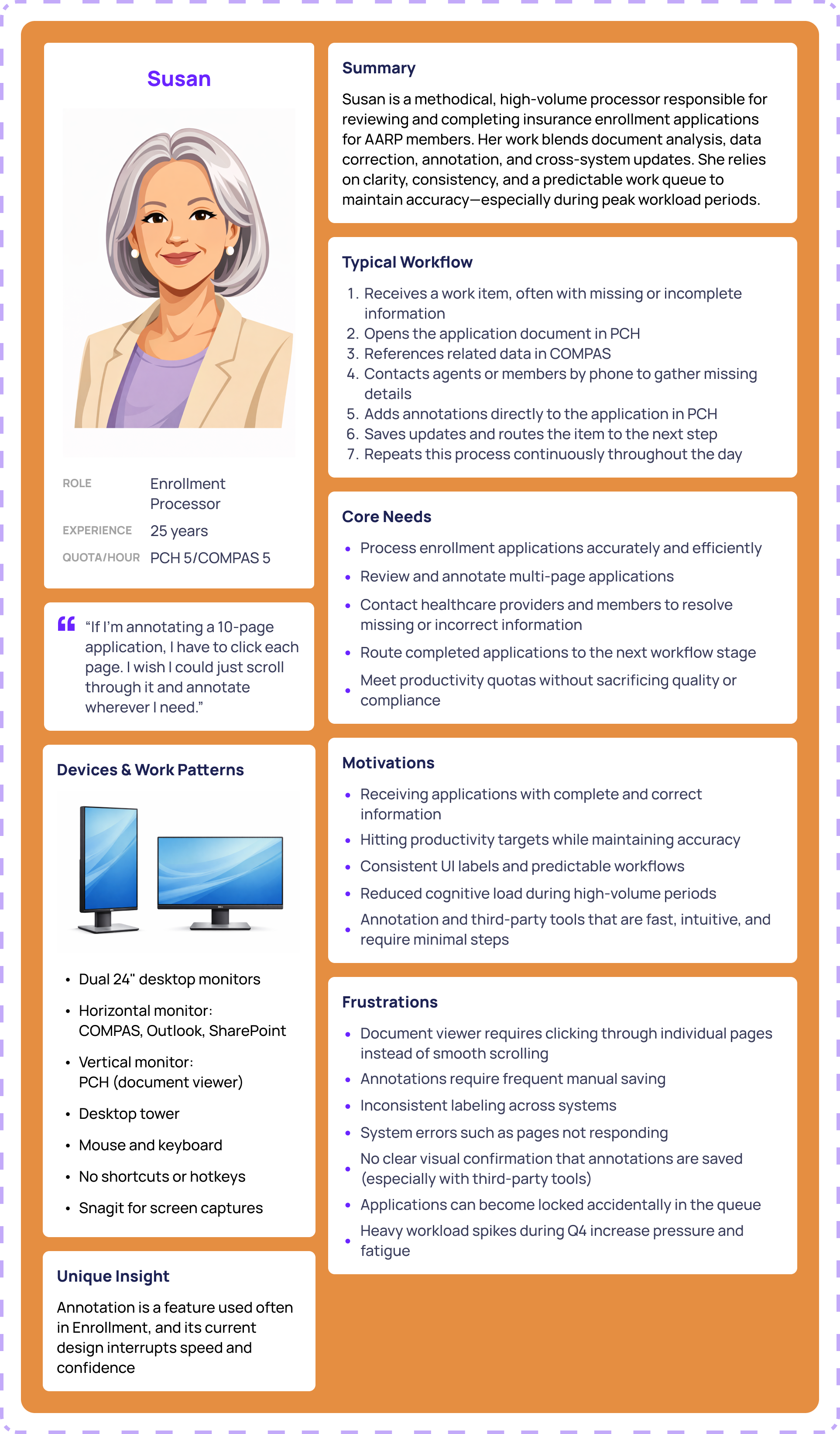 Following interviews, contextual observation, and survey analysis, I synthesized findings into personas representing claims adjusters and processors, informing a duplicate check redesign grounded in real-world workflows.