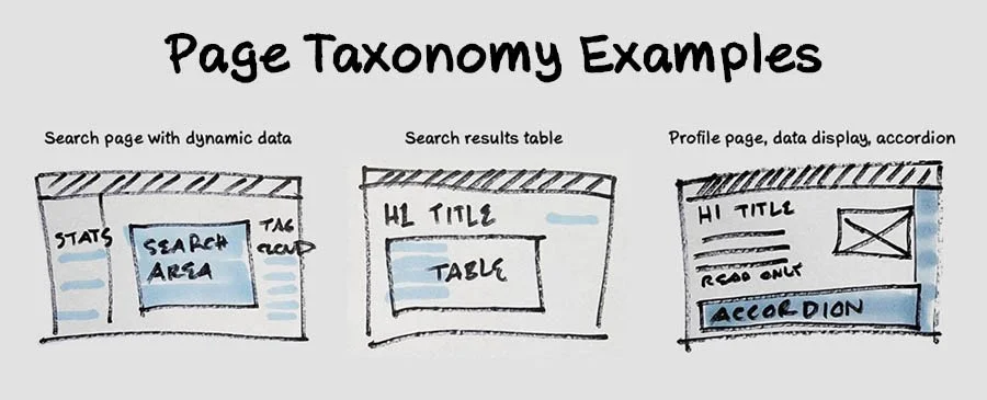 Page Taxonomy: My mental model for discovery and the team's shared understanding is what I call Page Taxonomy. Similar to a template but not treated as an asset. It's an exercise to stay stringent about how we create pages going forward. Page taxonomy is a page's actual type and purpose stripped down to the basics and the critical elements used.